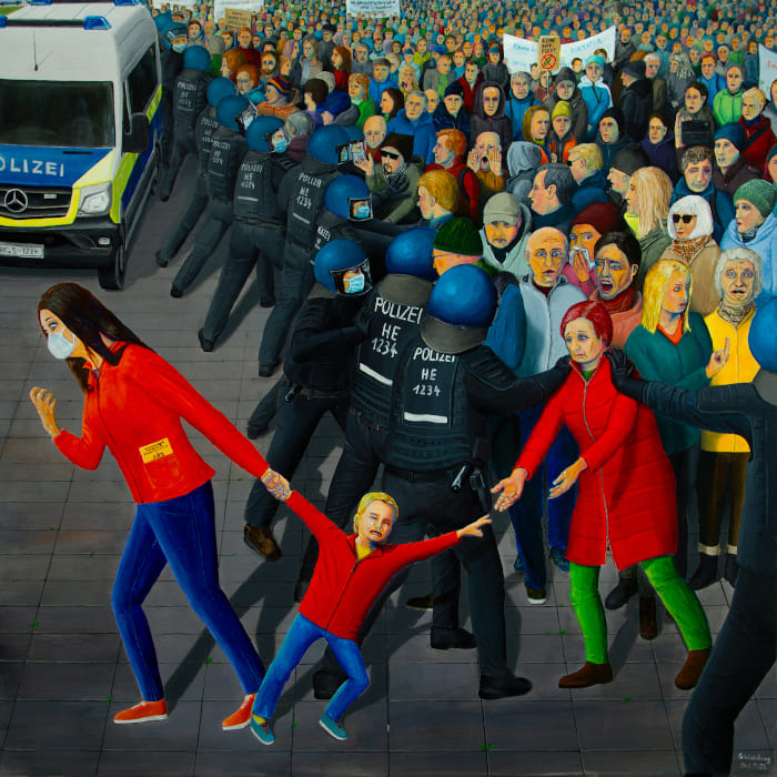 Jeder Betrachter des Bildes wird sich auf eine Seite schlagen. Als Zeitzeuge möchte ich mit dem Bild auf alle Missstände während der Pandemie aufmerksam machen.