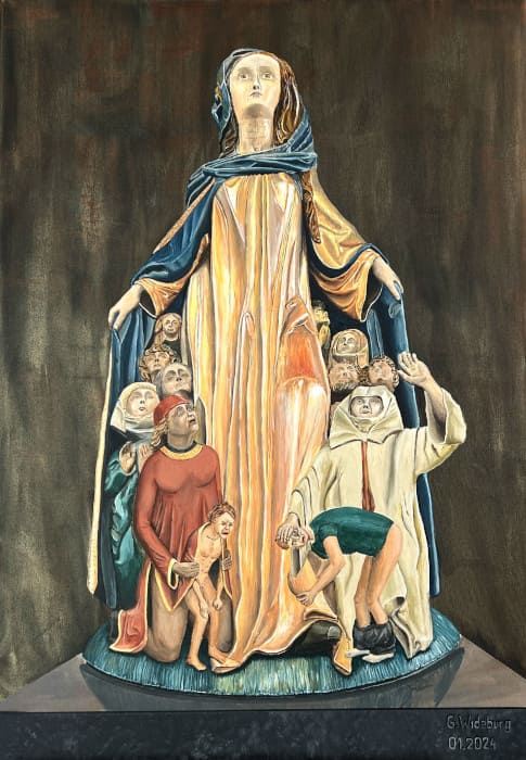 Was mich bewogen hat diese Darstellung der Madonna abzuwandeln und den Missbrauch unter ihrem Mantel bildlich darzustellen war eine Meldung in den Nachrichten vor nicht allzu langer Zeit (Nov. 2023) in der berichtet wurde, dass ein Trierer Bistumspriester der in mehreren Fällen des Kindesmissbrauchs überführt wurde nun erstmalig von einem Kirchengericht die Höchststrafe bekam. Er wurde aus dem Klerikerstand entlassen (siehe Zeit online).
